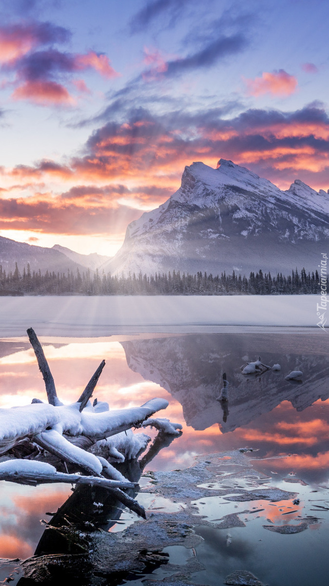 Edytor tapety: Ośnieżony konar drzewa na zamarzającym jeziorze