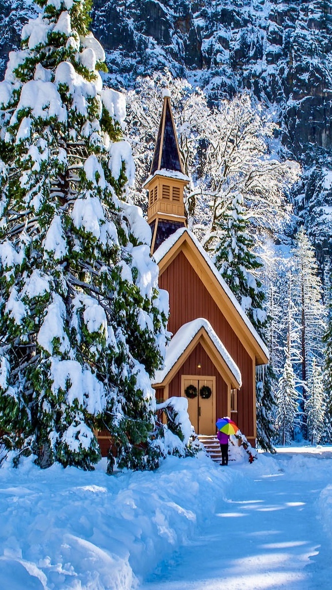 Edytor tapety: Kościół pod ośnieżonymi świerkami