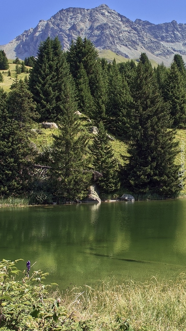 Edytor tapety: Drzewa i jezioro w szwajcarskich górach