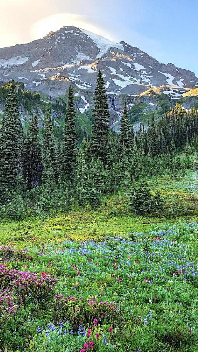 Edytor tapety: Drzewa i kwiaty na górskiej polanie