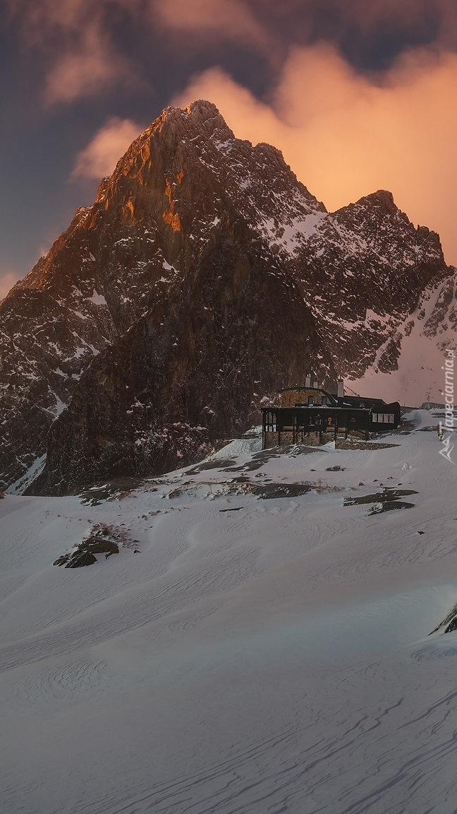 Edytor tapety: Dom przy ośnieżonych górach