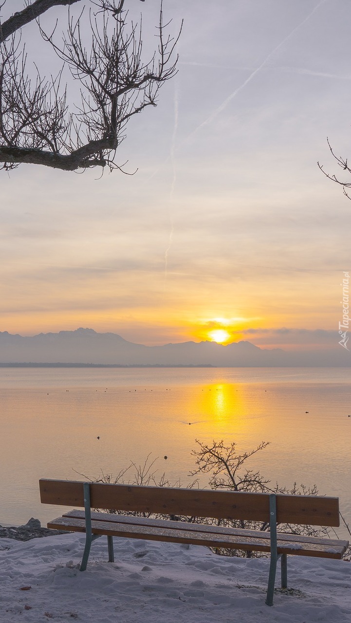 Edytor tapety: Ławka w śniegu na brzegu jeziora