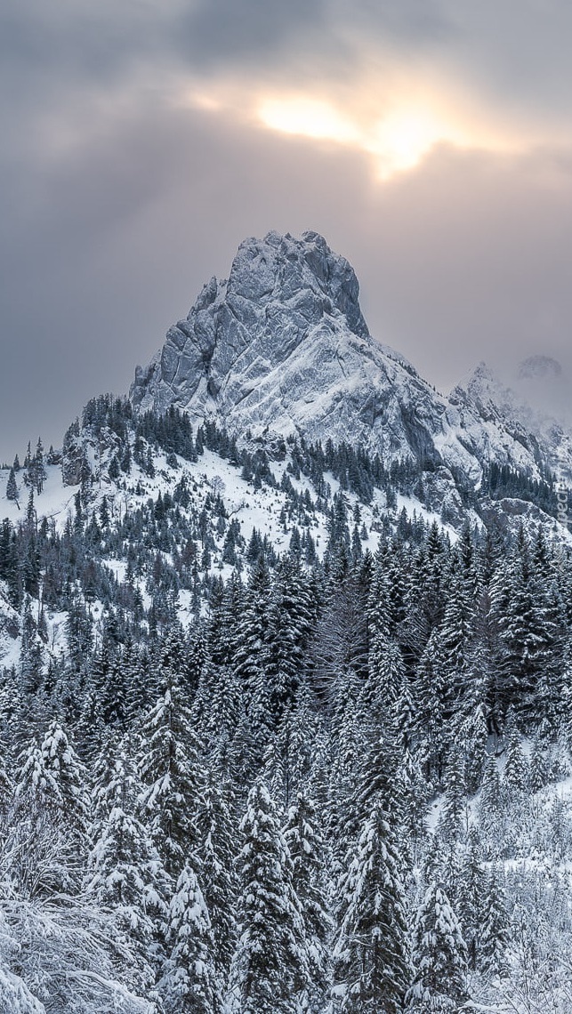Edytor tapety: Ośnieżony las i chmury nad górami