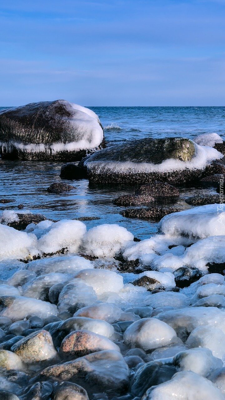Edytor tapety: Ośnieżone kamienie na brzegu morza