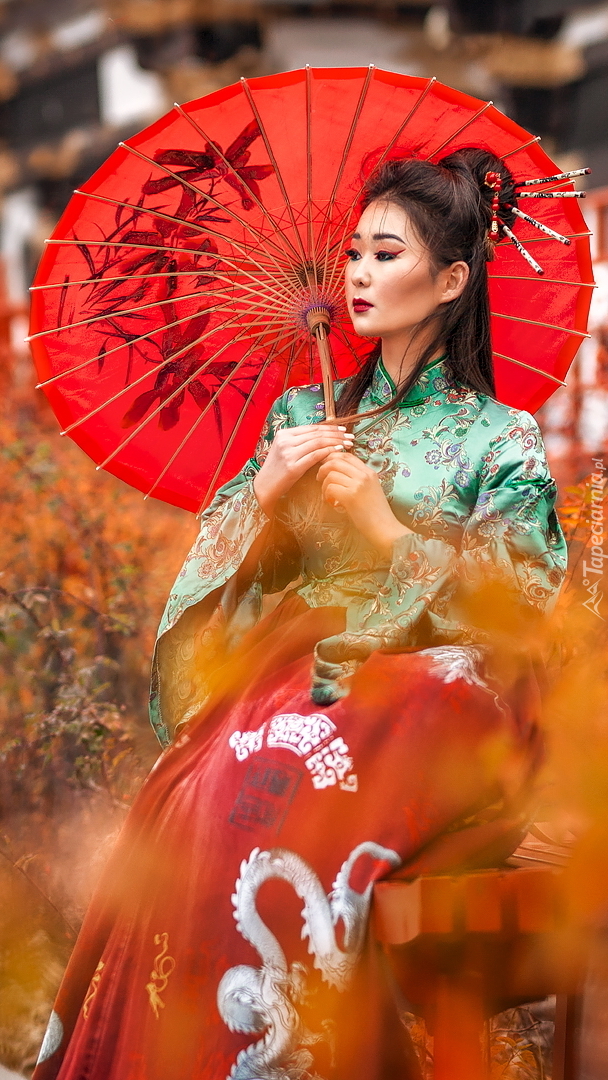 Edytor tapety: Azjatka z czerwoną parasolką