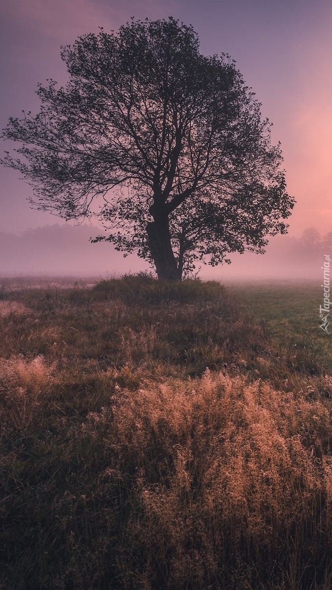 Edytor tapety: Drzewo na zamglonej o poranku łące