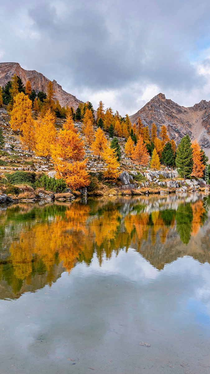 Edytor tapety: Pożółkłe drzewa nad górskim jeziorem