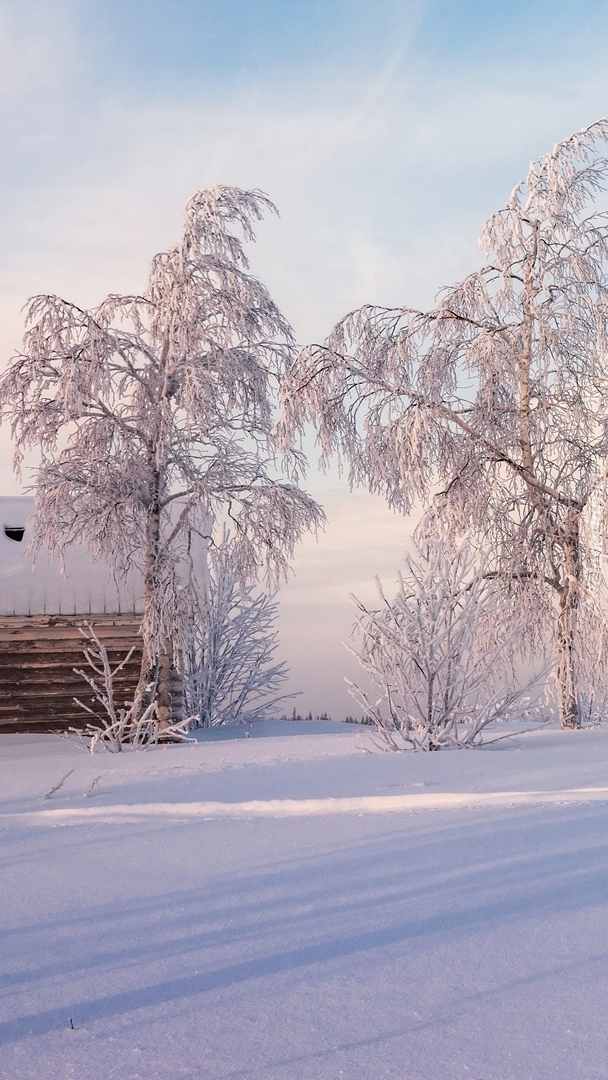 Edytor tapety: Dom pod ośnieżonymi drzewami