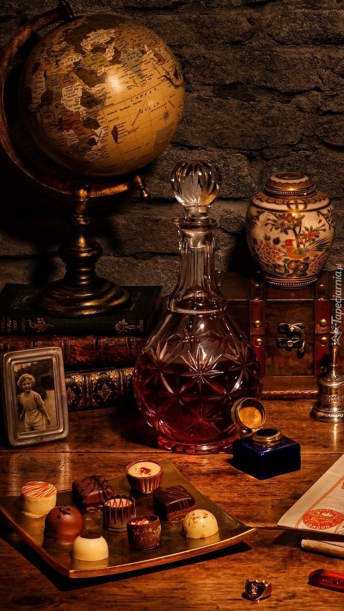 Edytor tapety: Globus obok karafki i pralinek