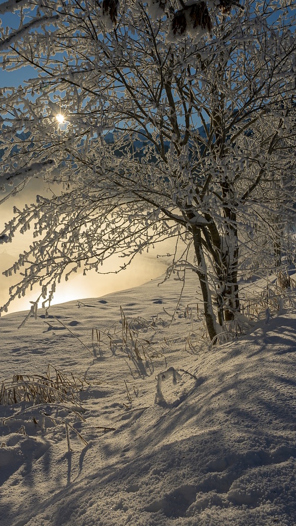 Edytor tapety: Ośnieżone drzewa nad zamglonym potokiem