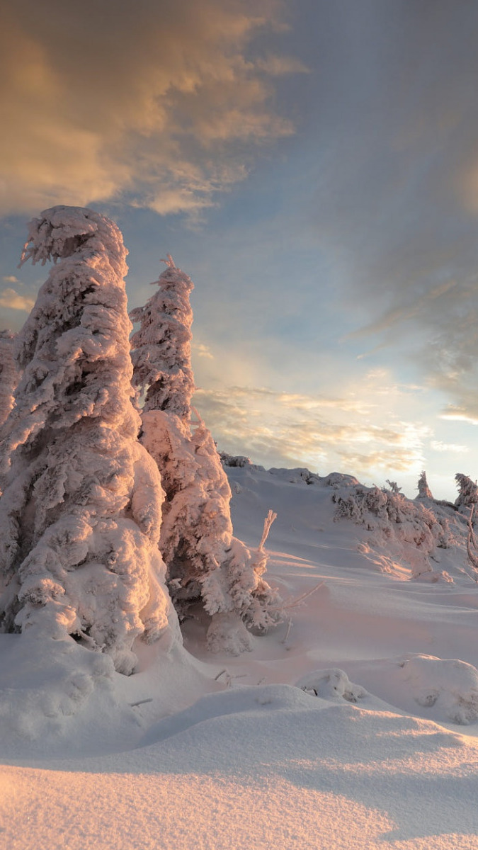 Edytor tapety: Zasypane śniegiem wzgórze i drzewa