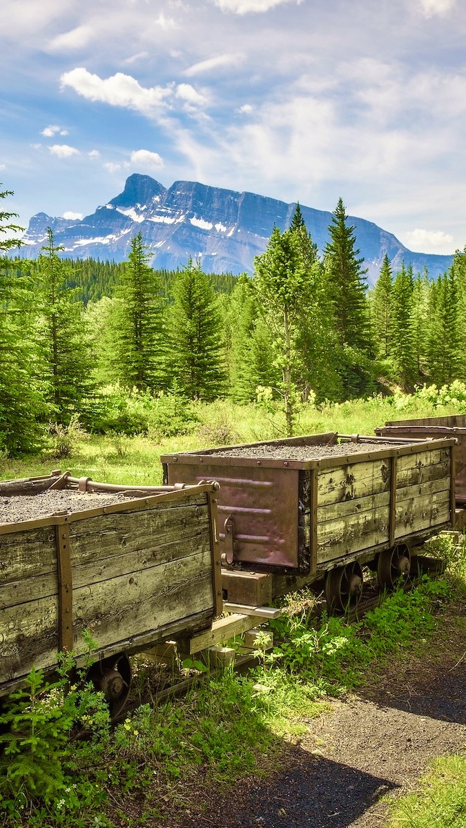 Edytor tapety: Wagoniki na szynach na tle gór