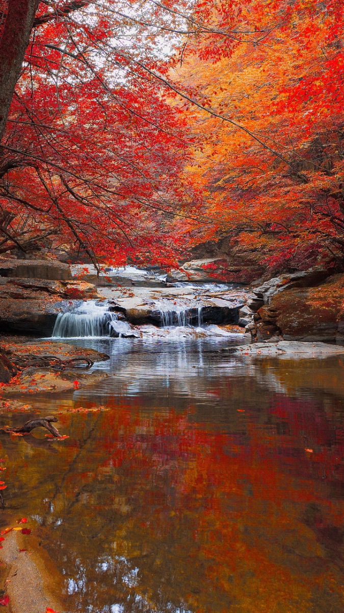 Edytor tapety: Kolorowe jesienne drzewa przy kamienistym potoku