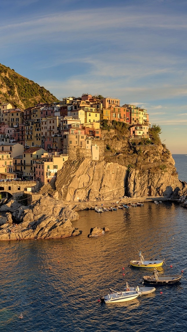 Edytor tapety: Rozświetlone domy na skałach w Manaroli