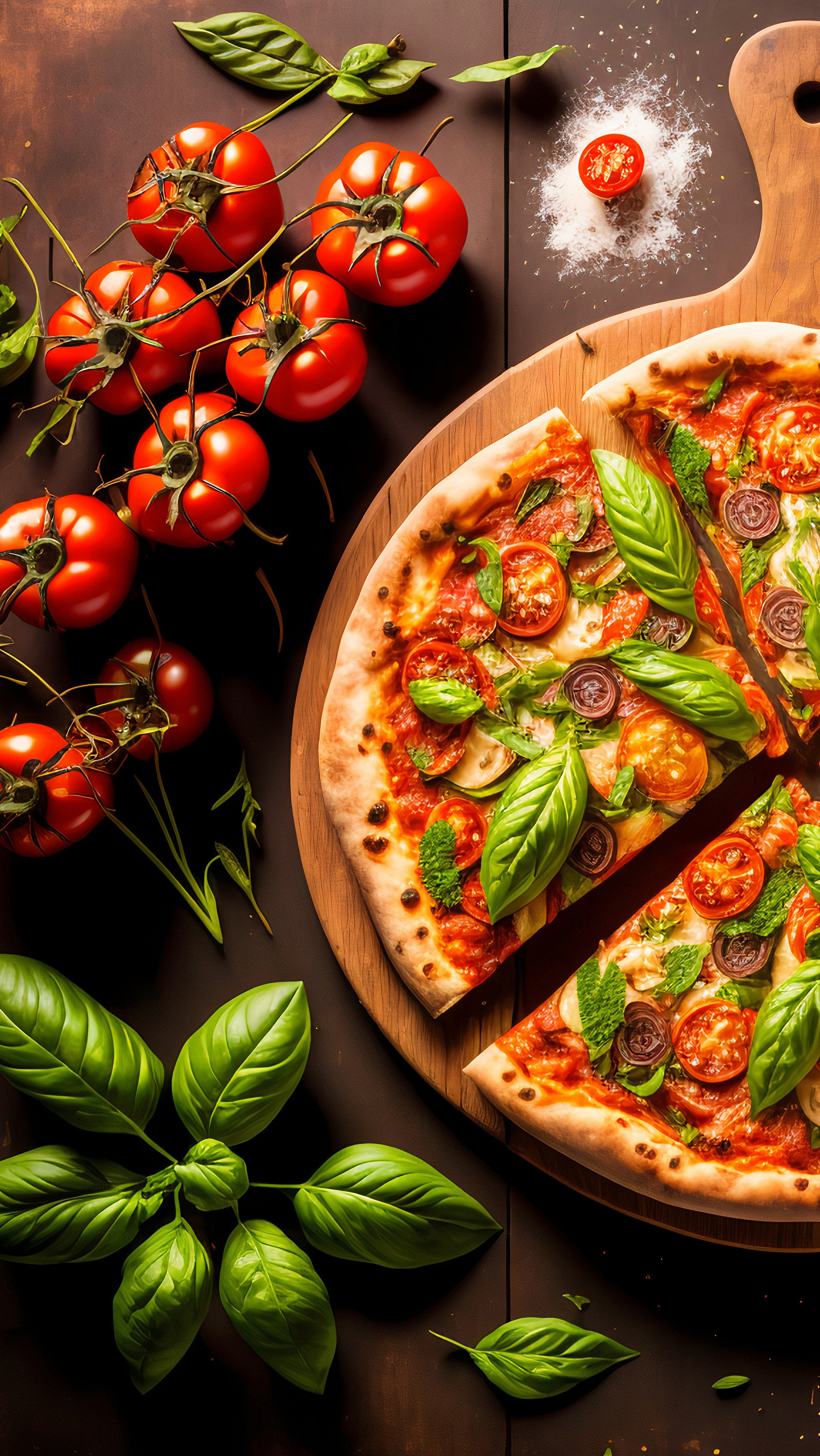 Edytor tapety: Pomidory obok pizzy na desce
