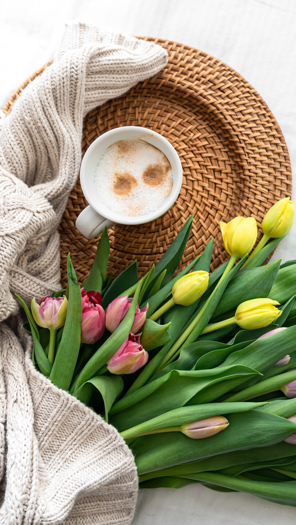Edytor tapety: Kawa i sweter obok kolorowych tulipanów