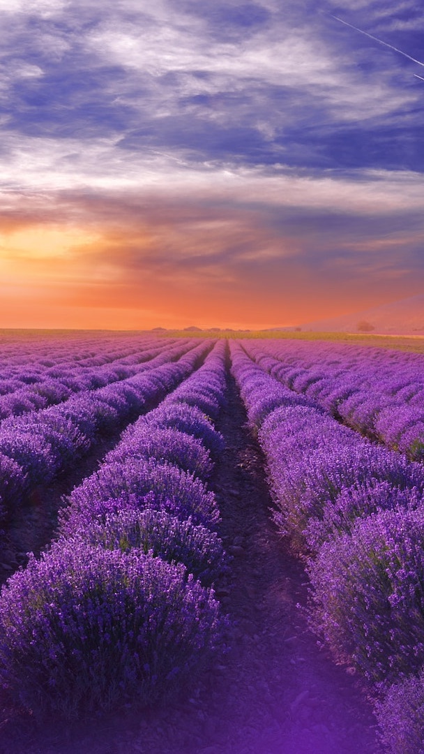 Edytor tapety: Pole lawendy o zachodzie słońca