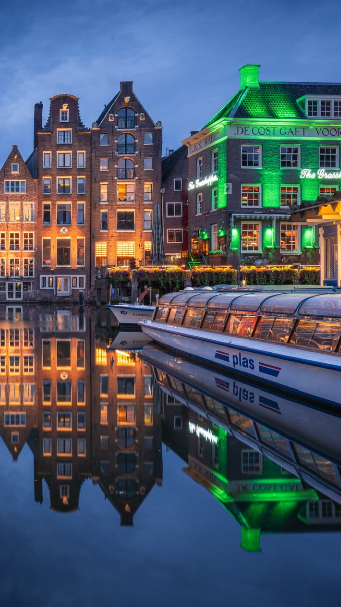 Edytor tapety: Domy i kanał w Amsterdamie nocą