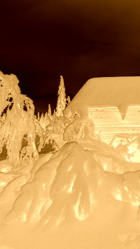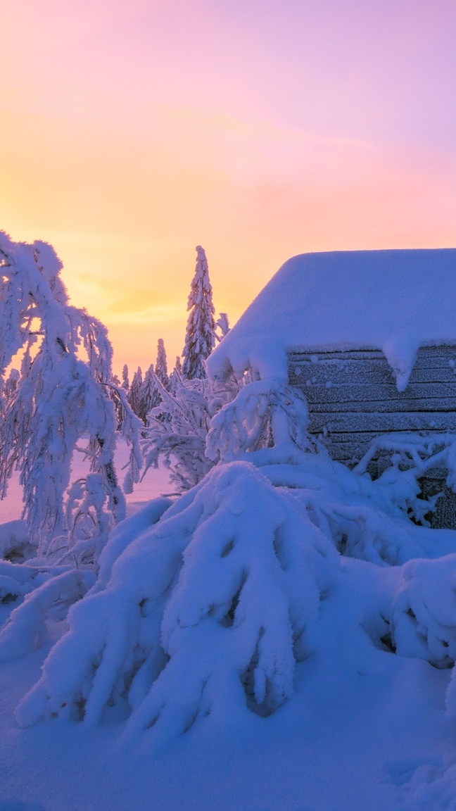 Edytor tapety: Zasypane śniegiem drzewa i drewniany dom