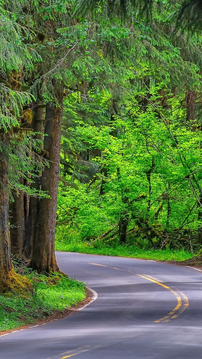 Edytor tapety: Zielone drzewa przy drodze w lesie