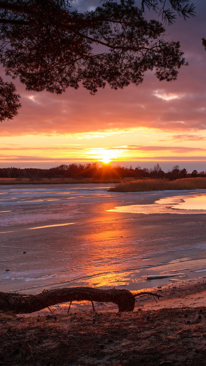 Edytor tapety: Zamarznięte jezioro o zachodzie słońca