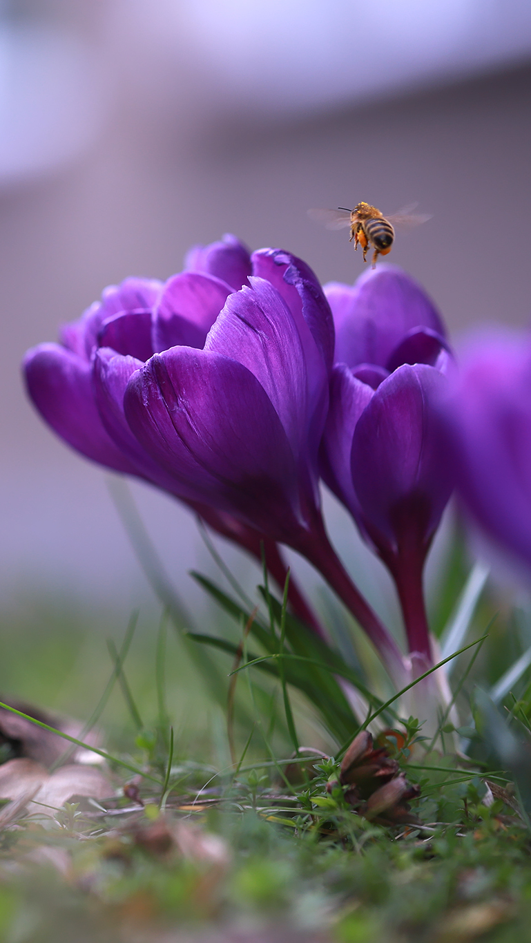 Edytor tapety: Pszczoła nad fioletowymi krokusami