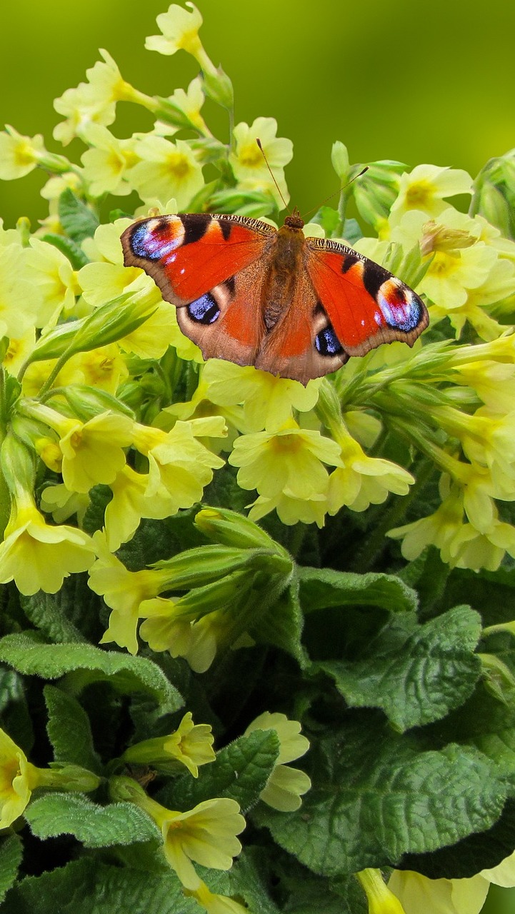 Edytor tapety: Rusałka pawik na pierwiosnkach