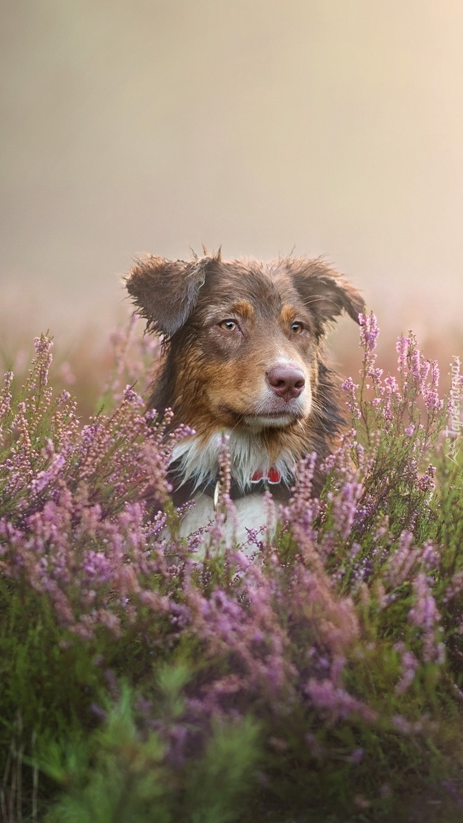 Edytor tapety: Owczarek australijski wśród wrzosów