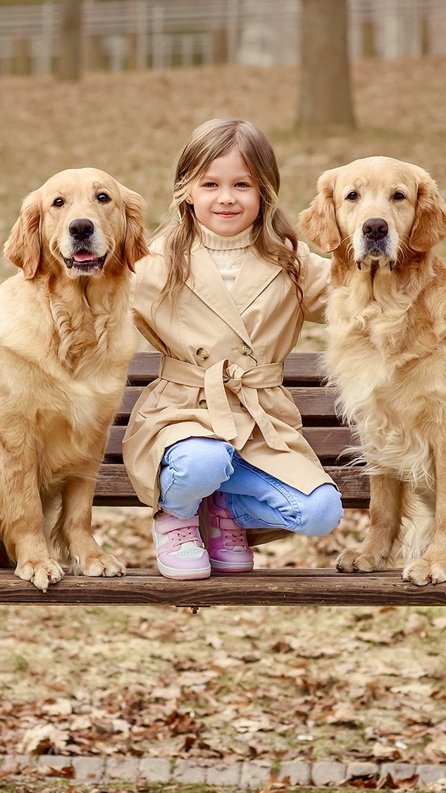 Edytor tapety: Dziewczynka i golden retrievery na ławce
