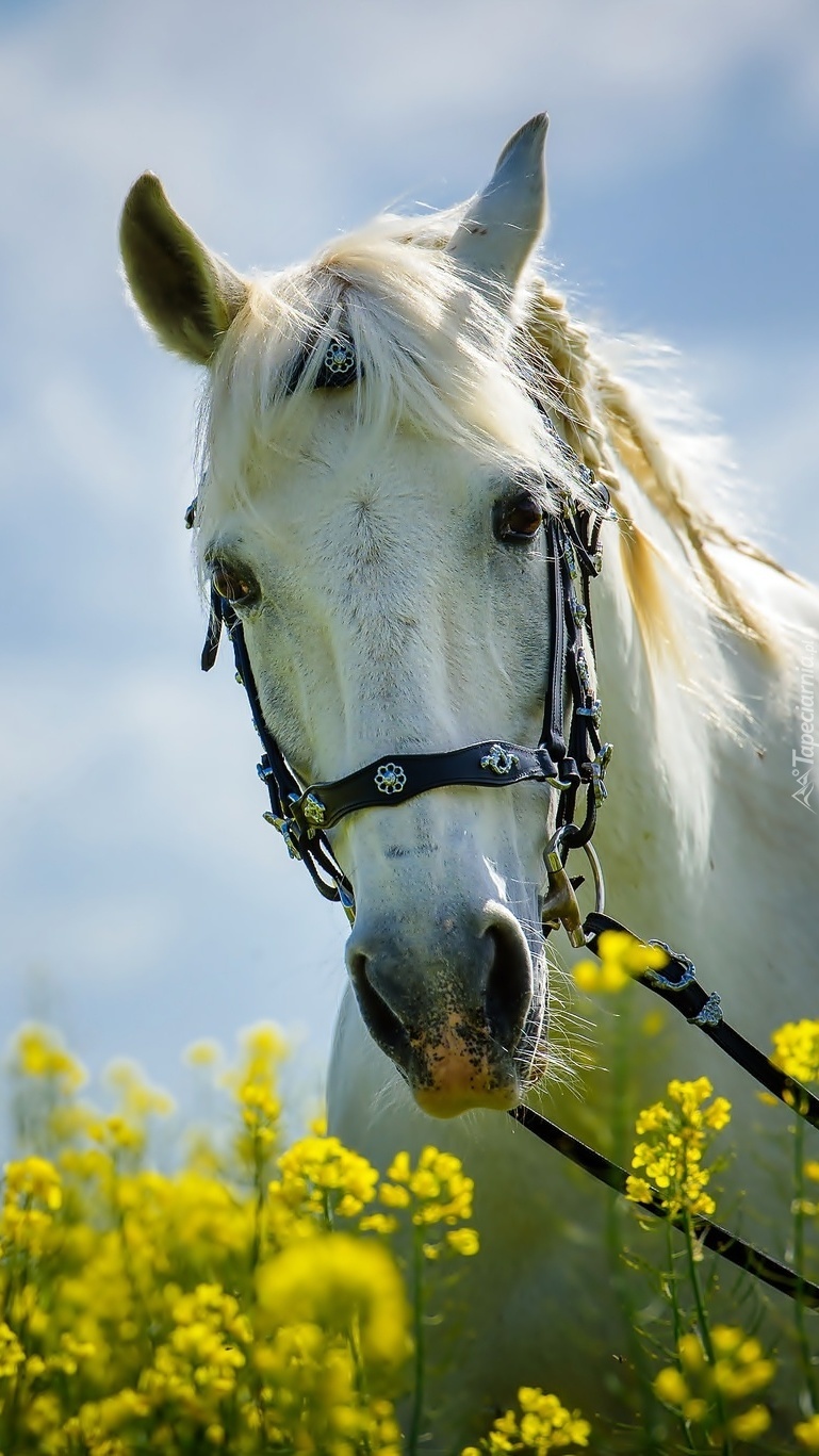 Edytor tapety: Biały koń w kwitnącym rzepaku
