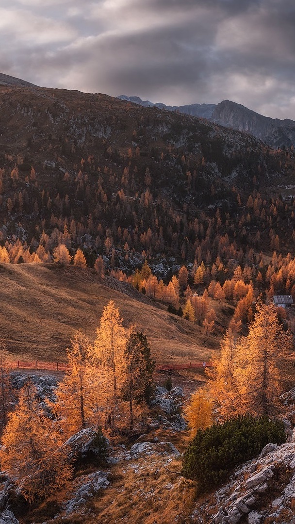 Edytor tapety: Modrzewie na skałach w górach