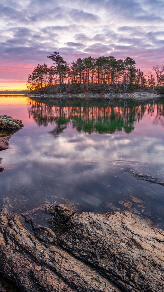 Edytor tapety: Drzewa na skałach nad jeziorem