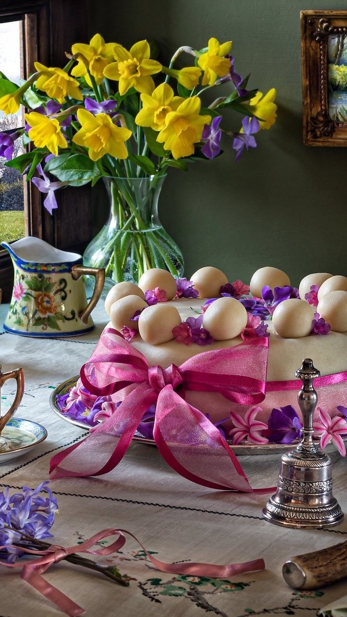 Edytor tapety: Bukiet żonkili obok tortu na stole