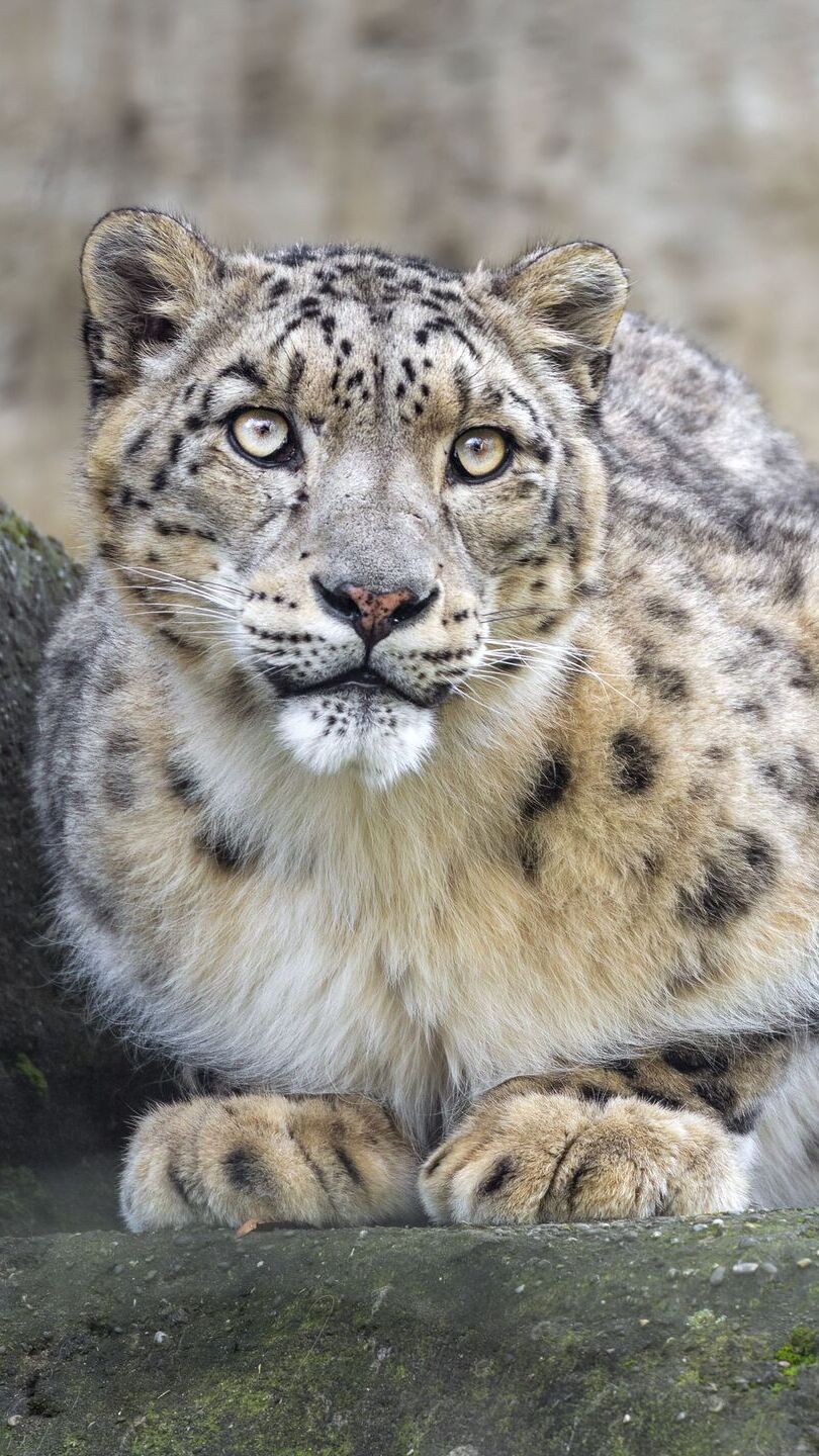 Edytor tapety: Przyczajony na skale irbis śnieżny