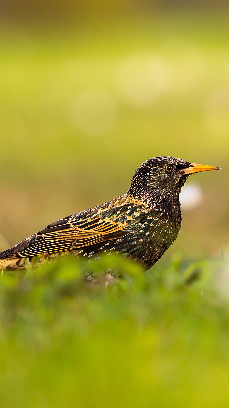 Edytor tapety: Szpak na trawie w zbliżeniu