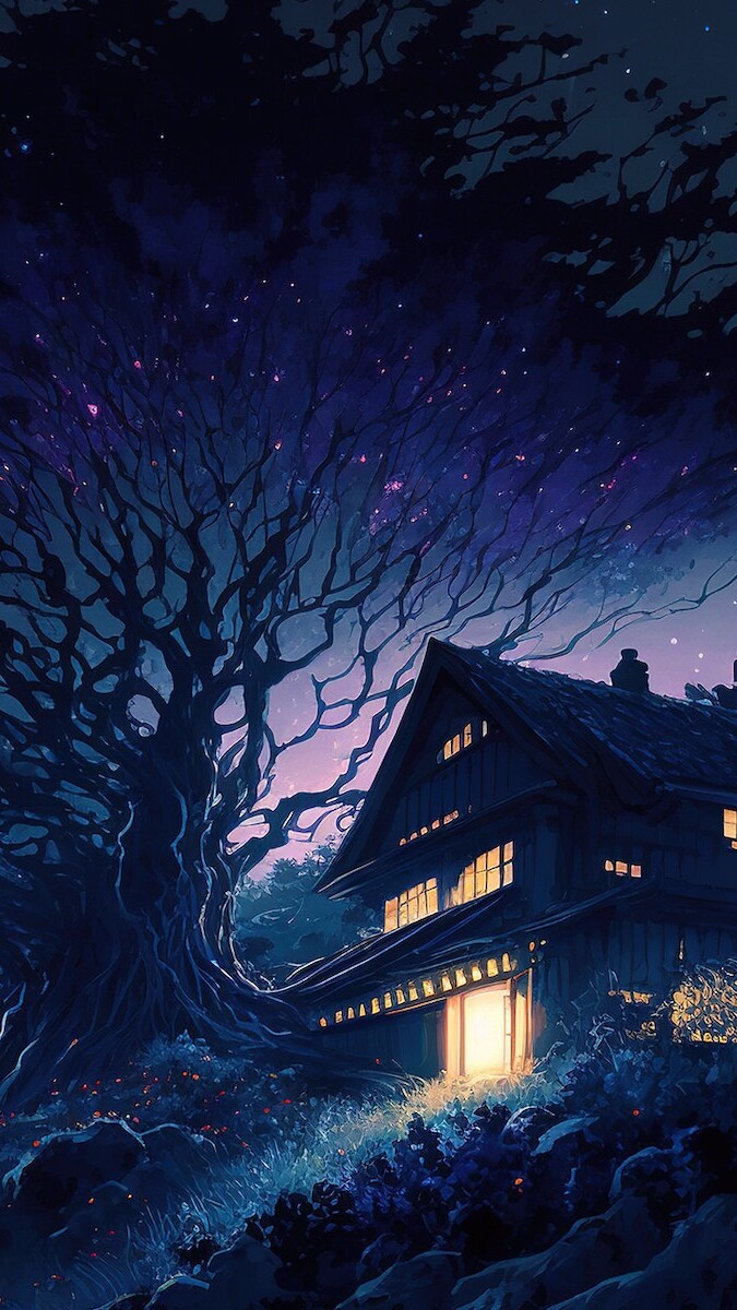 Edytor tapety: Oświetlony nocą dom pod drzewem