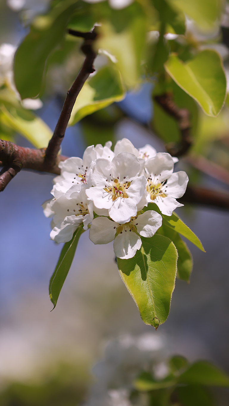 Edytor tapety: Rozświetlone białe kwiaty i liście jabłoni