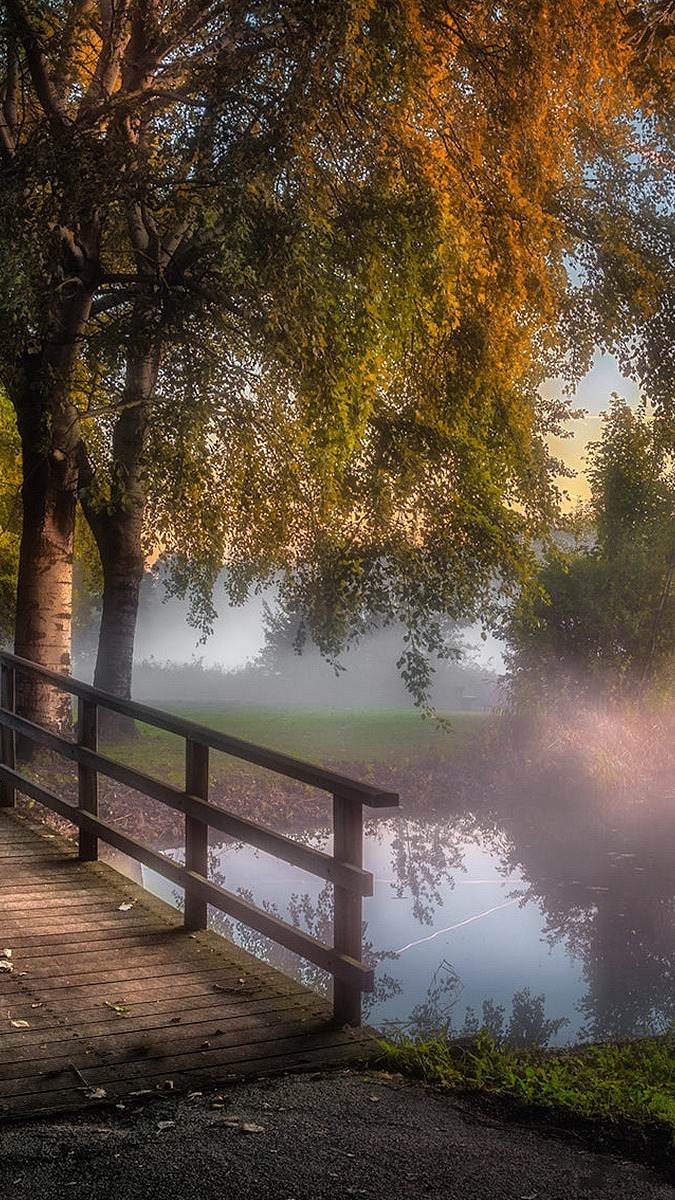 Edytor tapety: Drzewa i mostek nad zamglonym stawem