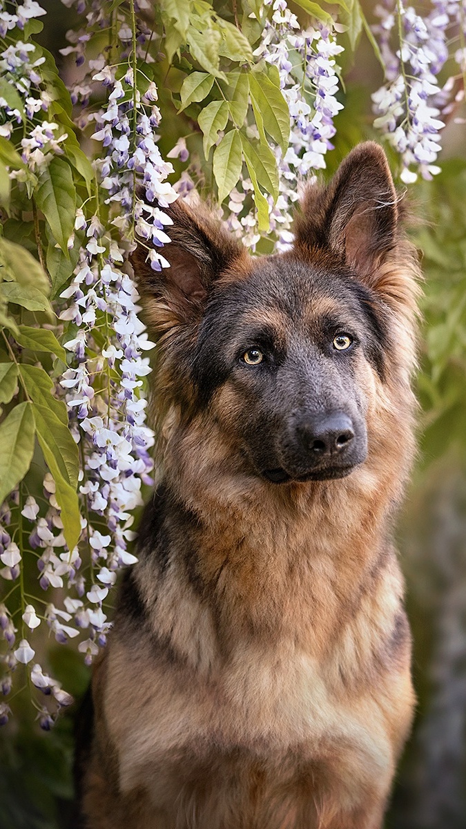 Edytor tapety: Owczarek niemiecki wśród glicynii
