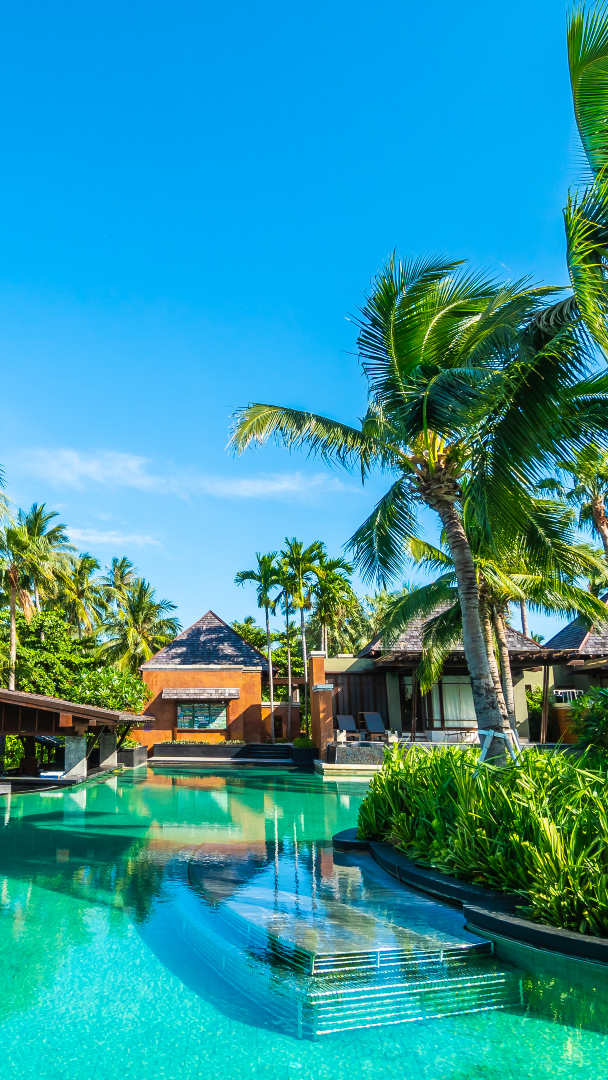 Edytor tapety: Palmy nad odkrytym basenem w tropikach