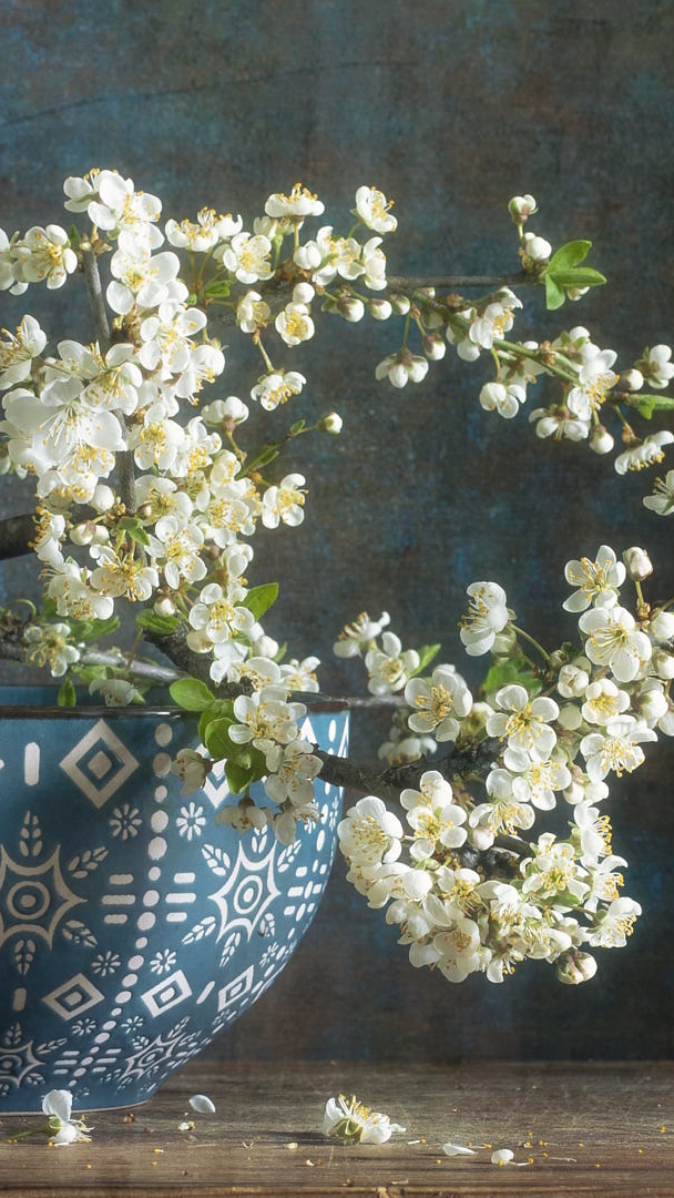 Edytor tapety: Okwiecona gałązka na misce