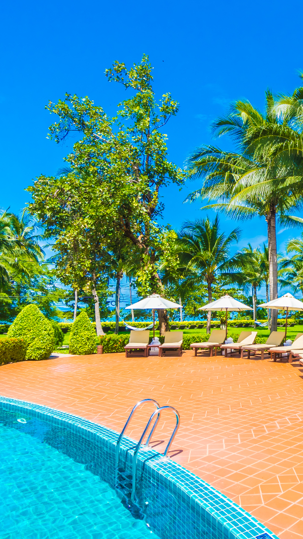 Edytor tapety: Palmy i leżaki nad basenem