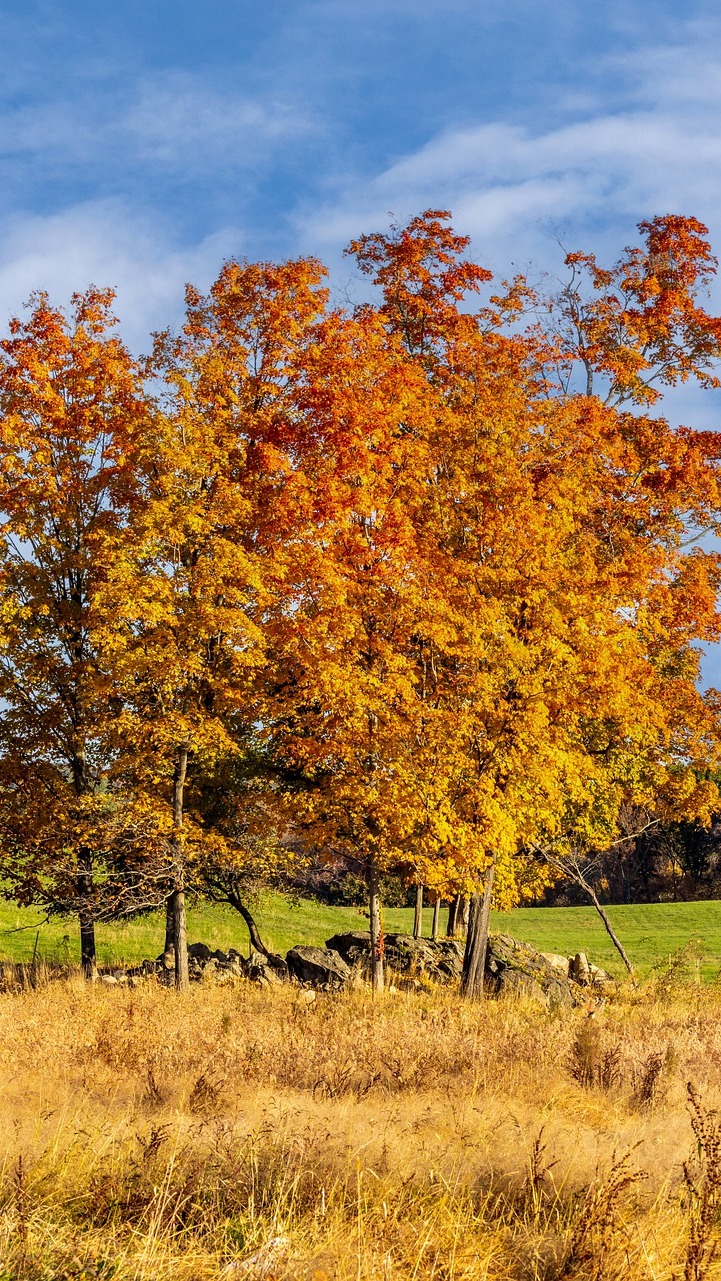 Edytor tapety: Rozświetlone pożółkłe drzewa na łące