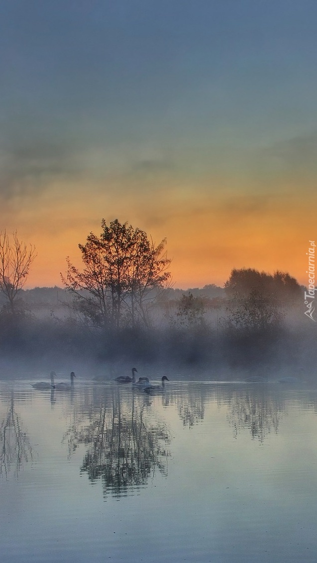 Edytor tapety: Łabędzie pływające po rzece we mgle