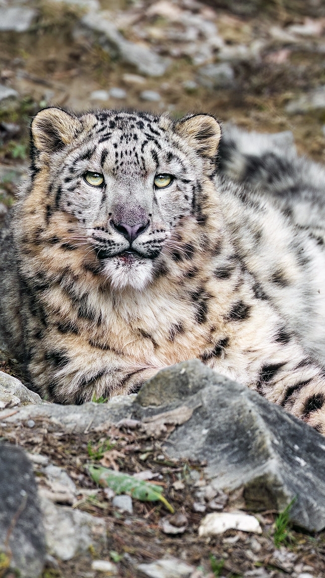 Edytor tapety: Irbis śnieżny leżący na kamieniach