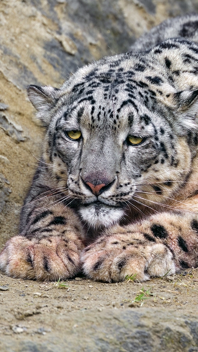 Edytor tapety: Irbis śnieżny leżący obok skały