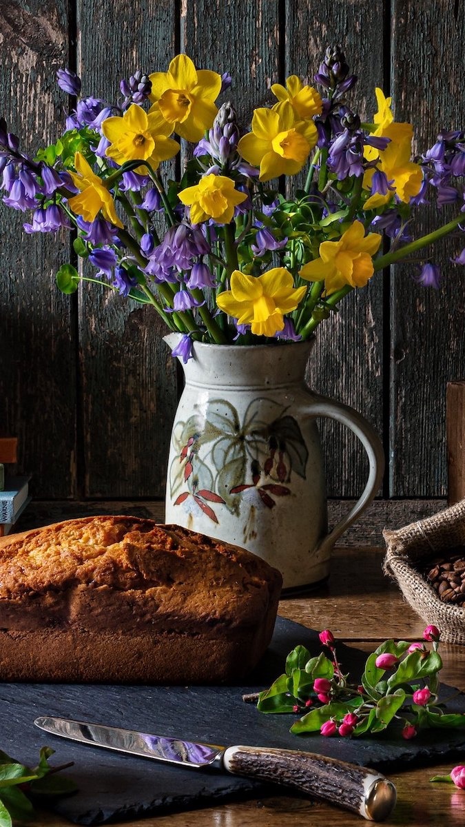 Edytor tapety: Chleb obok wiosennych kwiatów w dzbanku