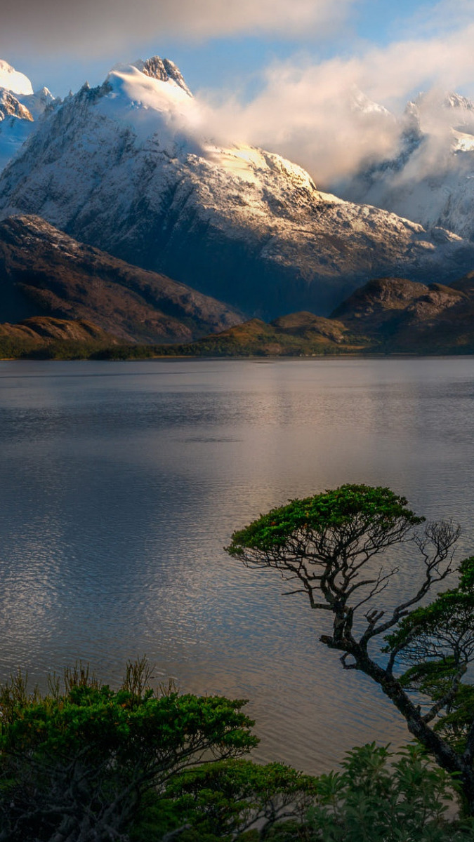 Edytor tapety: Ośnieżone góry nad jeziorem