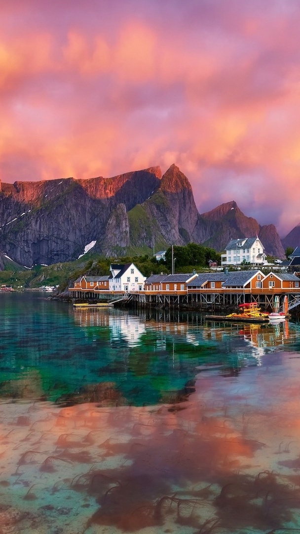 Edytor tapety: Domy na Lofotach pod kolorowym niebem