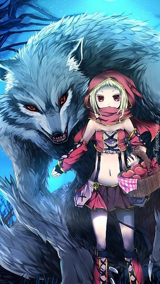 Edytor tapety: Czerwony Kapturek z wilkiem w grafice
